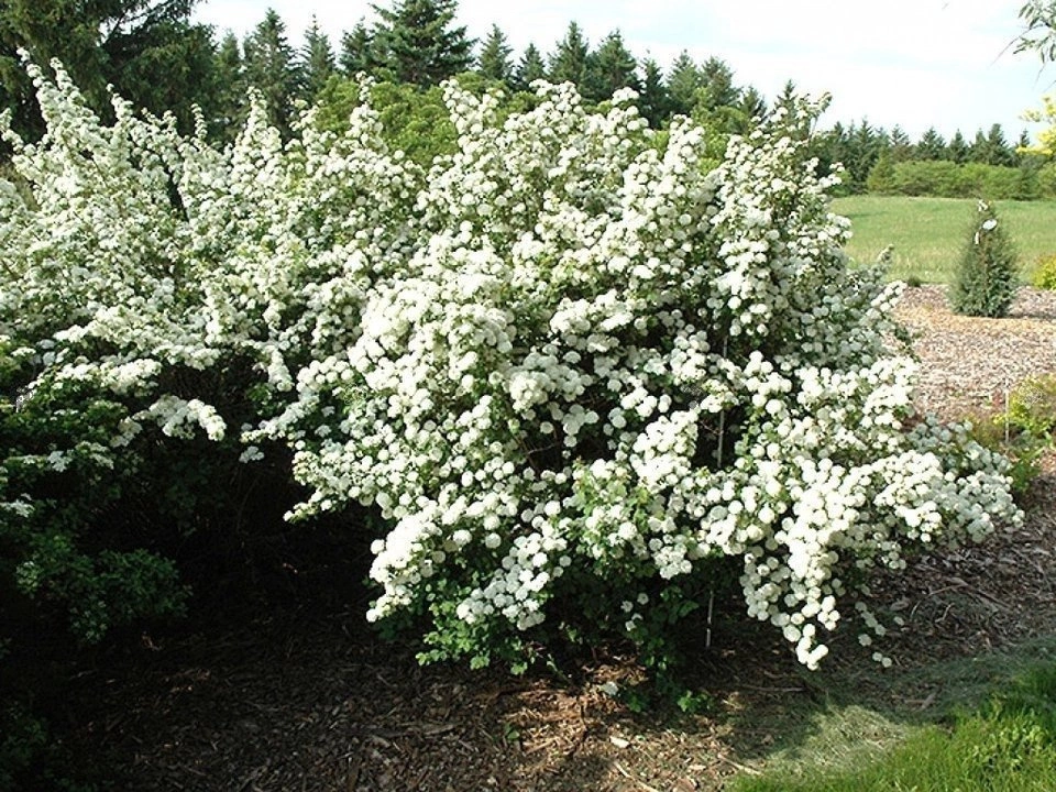 Przepiękny krzew o kulistym pokroju charakteryzuje się dużą ilością białych kwiatów, które pojawiają się już w maju.