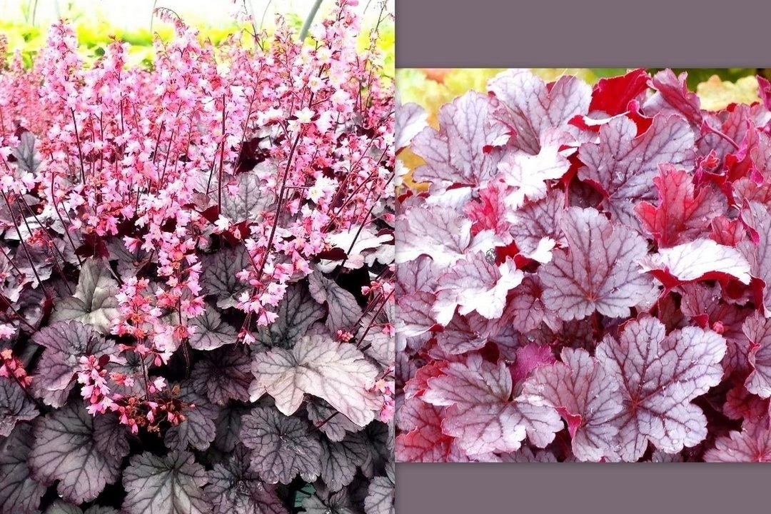 - Żurawka Milan PBR Heuchera to odmiana dorastająca do około 30cm wysokości, o liściach w ciemno bordowym kolorze ze srebrnym połyskiem i ciemniejszym unerwieniem. Dodatkową ozdobą są różowe kwiatostany.