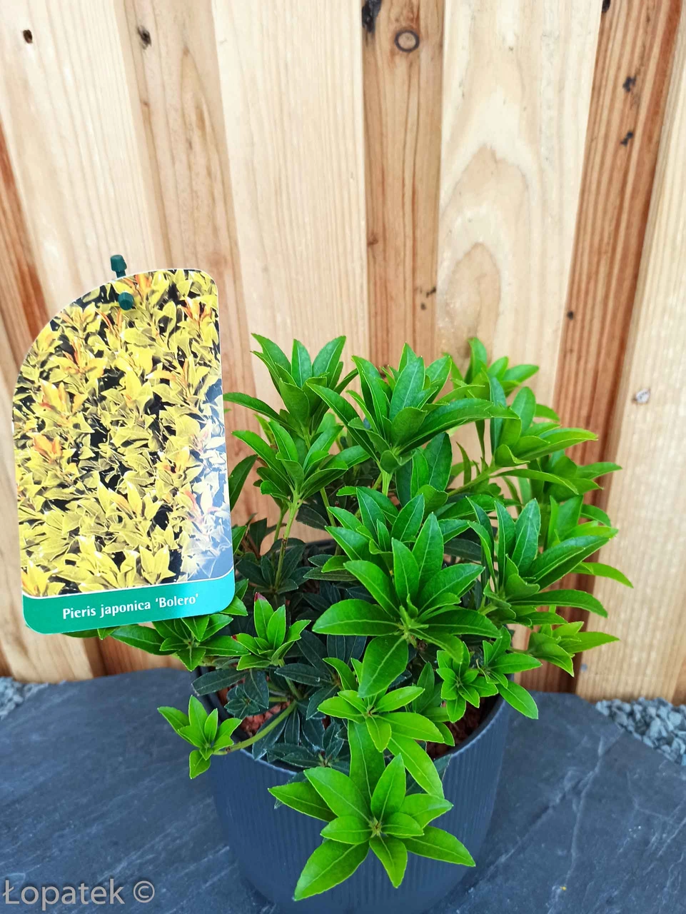 - Pieris japoński Bolero Pieris japonica niski, zimozielony krzew o kulistym pokroju. Liście z wierzchu ciemnozielone, a pod spodem matowe. Odmiana dekoracyjna ze względu na żółtozielone młode przyrosty i białe wiechowate kwiatostany z różowym odcieniem.