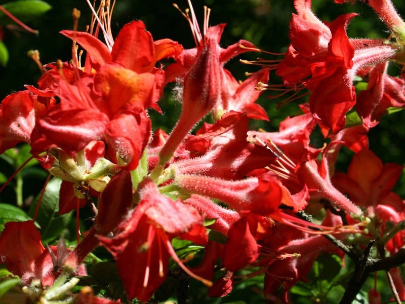 - Azalia Dr M.Oosthoek odmiana o intensywnie zielonych, sezonowych liściach i pięknych, dużych czerwonopomarańczowych kwiatach z nakrapianym wzorkiem na górnym płatku.
