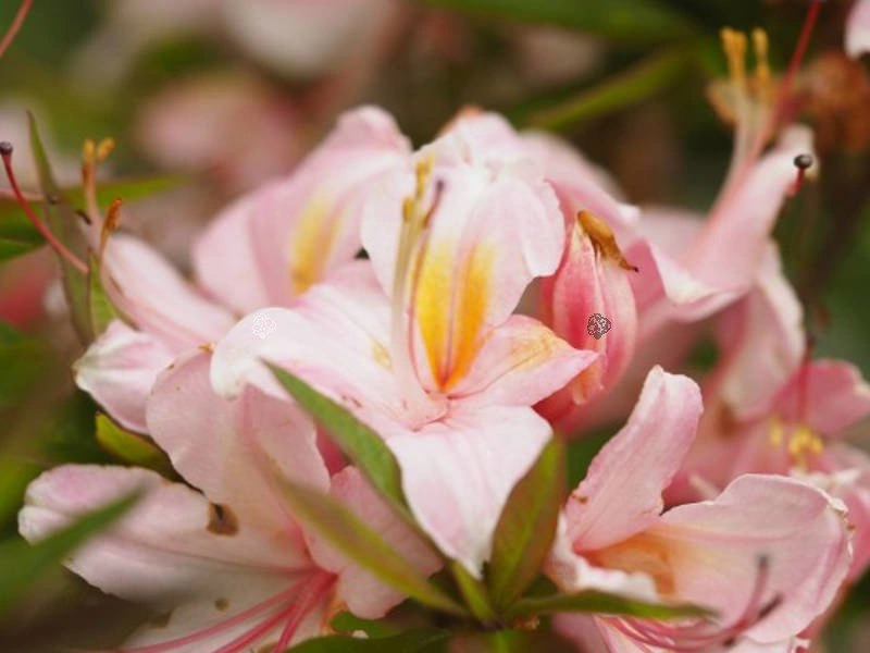 - Azalia Juniduft odmiana o sezonowych zielonych i błyszczących liściach i pięknych jasnoróżowych kwiatach z żółtą plamką na górnym płatku, lekko pofalowane.