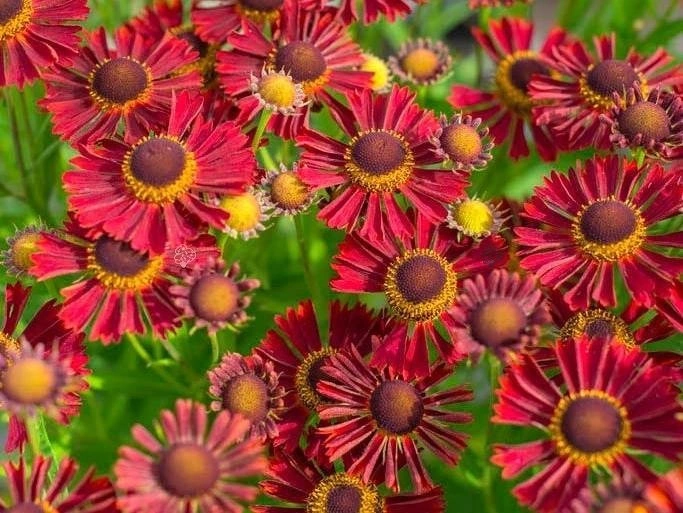 - Dzielżan czerwony Siesta Hellenium odmiana wytwarzająca piękne, ciemnoczerwone kwiaty z charakterystycznym środkiem o wyrazistych pręcikach. Kwiaty pięknie komponują się z zieloną barwą lancetowatych liści.
