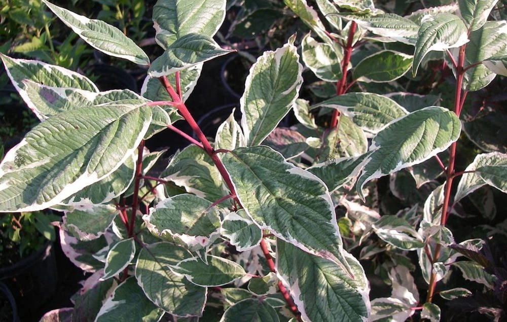 Dereń biały Sibirica Variegata Cornus alba to rozłożysty krzew, który charakteryzuje się czerwonymi pędami, które z czasem ciemnieją aż do głębokiego brązu, a także gęstym listowiem.