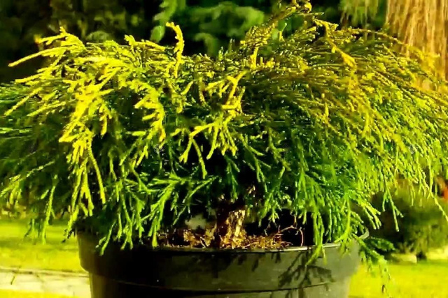- Cyprysik groszkowy Sungold jest rośliną wolno rosnącą i bardzo oryginalną. Posiada cienkie, sznurowate pędy w odcieniu złoty, które kaskadowo zwisają od czubka aż do samej ziemi, tworząc przy tym złotą fontannę.