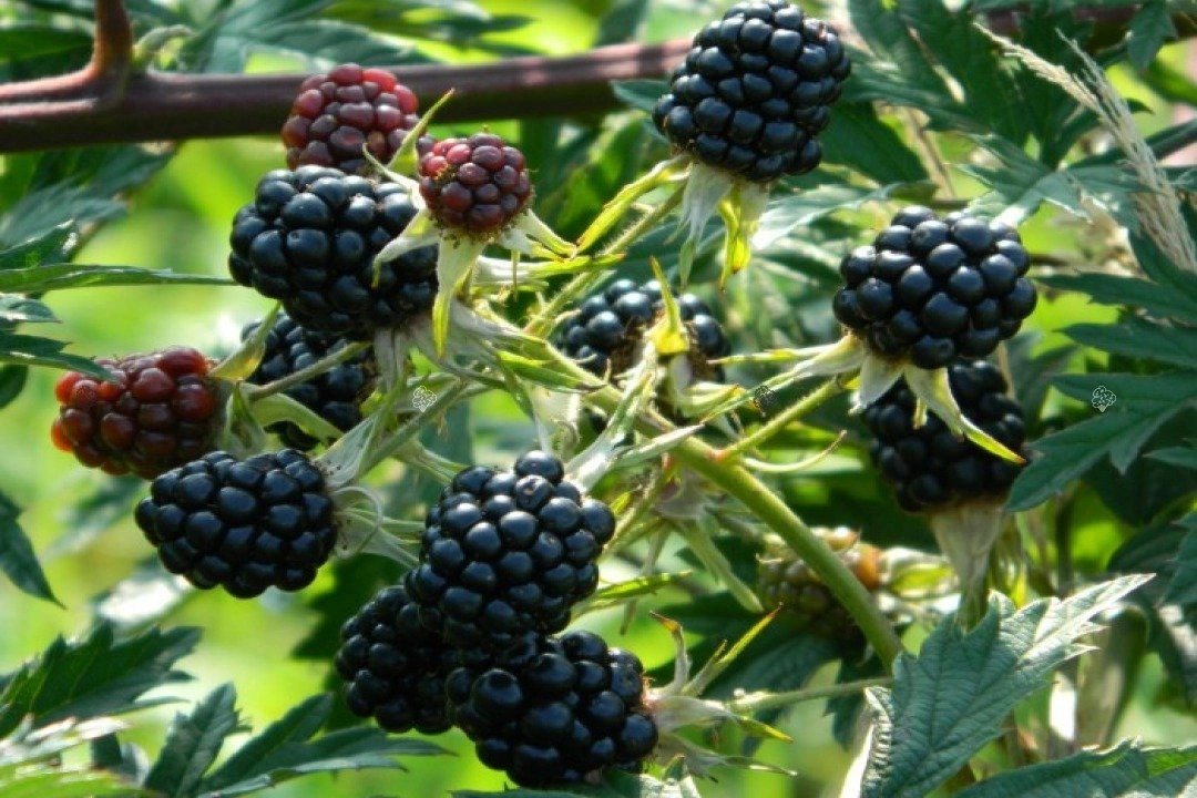Jeżyna bezkolcowa Thornless Evergreen posiada słodkie duże owoce i nietypowe postrzępione liście, które nadają jej ozdobny charakter.